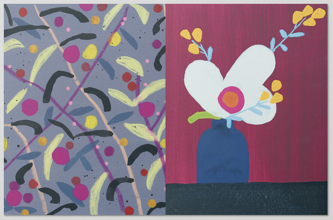 I started making Shuffled Pairs in early December at a makeshift drawing table looking out at the Mendocino coast. I set up at the window to paint the landscape but found myself making loosely patterned ink paintings instead. I then tore them into 3x4” segments, eight from each painting. I liked how they looked combined in a big group, but not as much as I liked specific pairings.